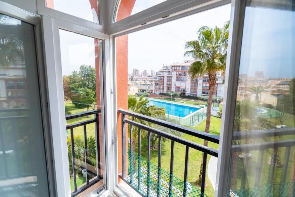 El apartamento cuenta con 2 dormitorios, 1 baño, ropa de cama, toallas, TV, cocina totalmente equipada y balcón con vistas a la piscina.