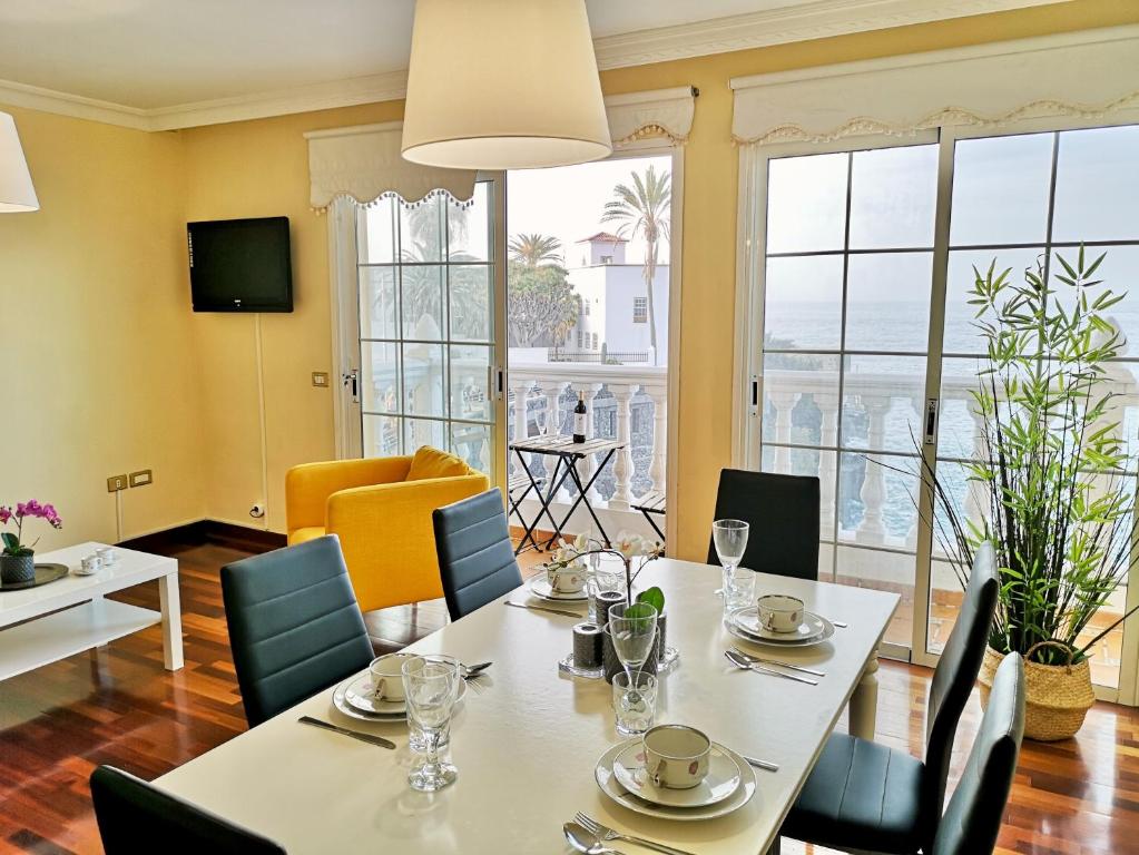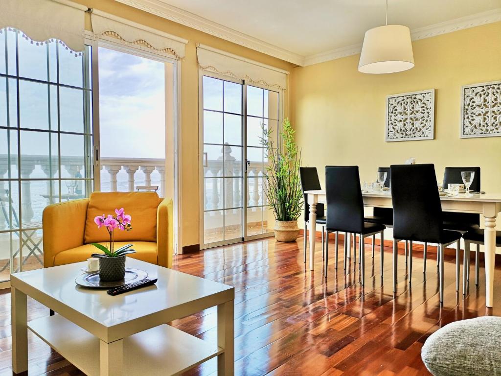 Completamente equipado y luminoso, este encantador alojamiento tiene vistas inmejorables al mar y al paseo marítimo de San Telmo, tanto desde el salón y el dormitorio principal, como desde su balcón. Los dormitorios son acogedores, amplios, y con mucho espacio para guardar la ropa, Uno de ellos cuenta con una cama de matrimonio, y el otro con dos camas separadas. Aparte de un sofá-cama de 2 plazas. Hay un cuarto de baño muy espacioso y con bañera, y otro con ducha. En su gran cocina dispondrá de horno, microondas y todo lo que espera en una cocina completamente equipada, incluido un lavavajillas para hacer mas cómodo el día a día. Desde la sala de estar se pueden ver las olas rompiendo contra los charcos naturales. Dispone de un cómodo sofá, sillón, TV de pantalla plana, y una mesa de comedor para hasta 6 personas. El piso se encuentra en pleno Paseo de San Telmo, en la segunda planta (sin ascensor), y en primera línea del mar.