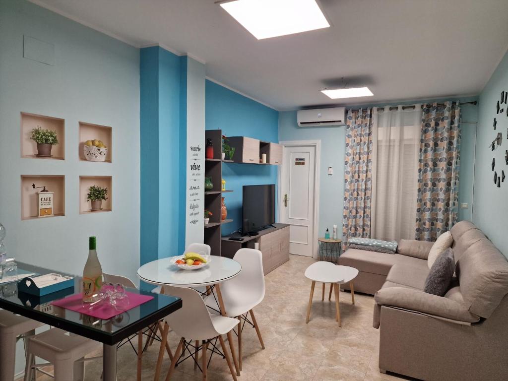 Amplio apartamento para dos personas con baño completo equipado con secador de pelo , cocina totalmente equipada con horno y vitro , microondas, cafetera de cápsulas dolce gusto, tostadora , el menaje necesario para cocinar , nevera y lavadora. Gran dormitorio con cómoda cama de matrimonio , armario, sinfonier y mesitas , equipado con tv plana de 22" , plancha y mesa de planchar. Cómodo salón con mesa de comedo , mesa de centro, sofá y tv plana de 50 " dvd . Pequeña terraza exterior equipada con mesa y sillas.