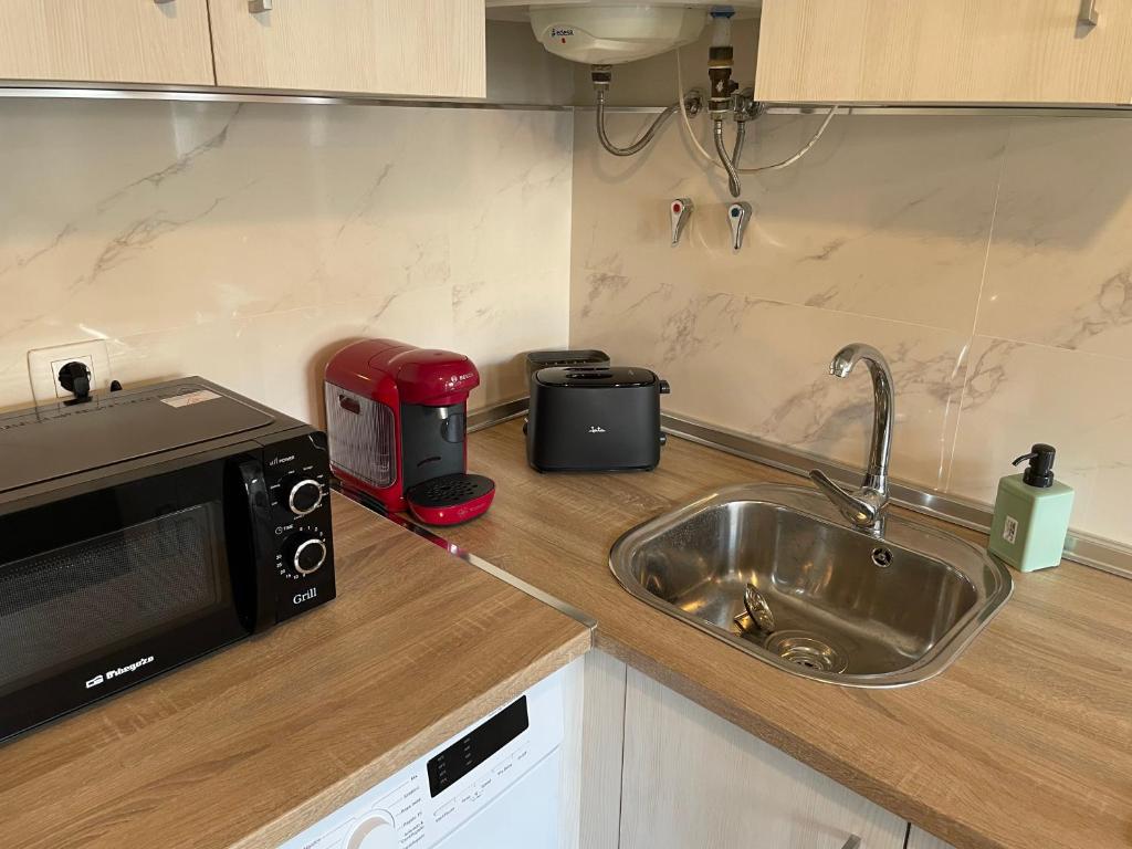 El apartamento cuenta con 1 dormitorio, TV de pantalla plana, lavadora, baño con ducha y cocina equipada con microondas y nevera.