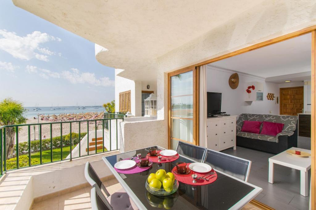 Bonito apartamento en el norte de Mallorca. La casa tiene 2 dormitorios con baño ensuite cada uno, que ofrece espacio para hasta 4 personas. La ubicación es ideal. Está justo en la playa de arena blanca de arena en el Puerto de Alcudia. Para los amantes de la piscina hay una piscina comunitaria disponible. Tumbonas disponibles y suficiente de césped para tomar el sol; y para los niños hay una piscina infantil separada. El apartamento es luminoso y acogedor, dispone de aire acondicionado en la sala de estar y dormitorios. La cocina está totalmente equipada. Todas las habitaciones están orientadas frente al mar y la playa! Un balcón con capacidad para 4 personas. Aquí se puede tomar al aire libre con una vista del ajetreo y el bullicio de las comidas de playa acogedoras. Unas vacaciones de ensueño en una de las playas más bonitas de Mallorca, aquí !! El casco antiguo de Alcudia, con sus lugares de interés como la iglesia y la antigua muralla de la ciudad y el mercado semanal está a sólo 15 minutos a pie. El paseo marítimo para pasear y salir es igual en el apartamento cercano. También encontrará numerosos bares y restaurantes.