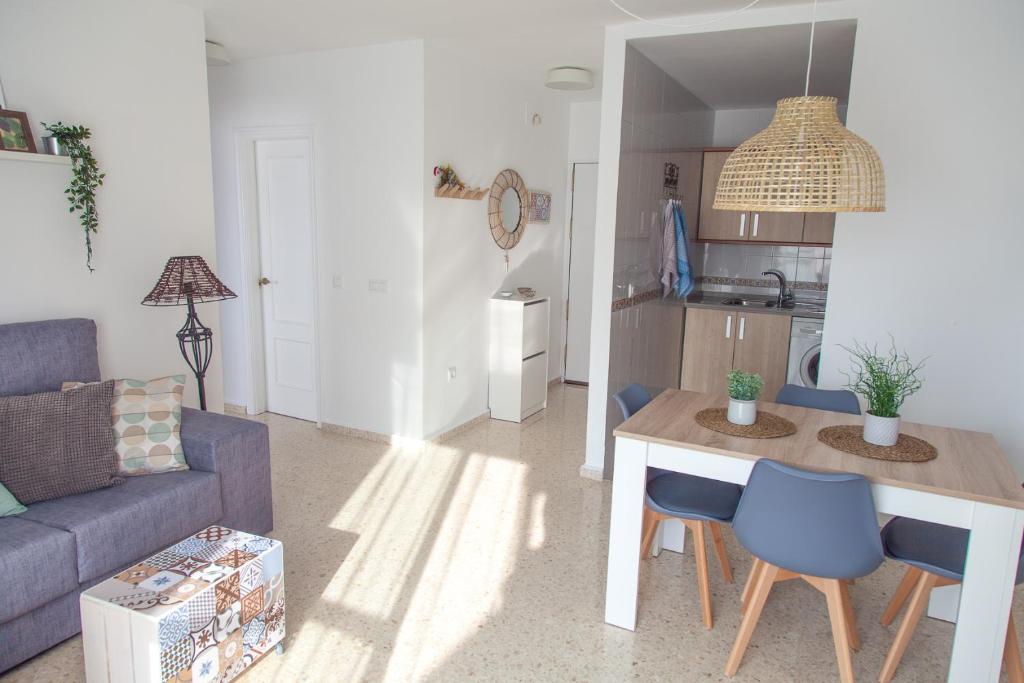 Apartamento con aire acondicionado, 2 dormitorios, TV de pantalla plana, zona de comedor y cocina con microondas y nevera.
