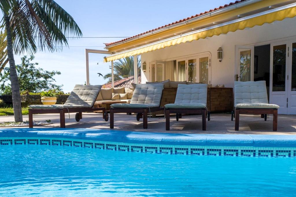 La villa cuenta con 4 dormitorios, 4 baños, ropa de cama, toallas, TV de pantalla plana, zona de comedor, cocina totalmente equipada y patio con vistas a la piscina.
