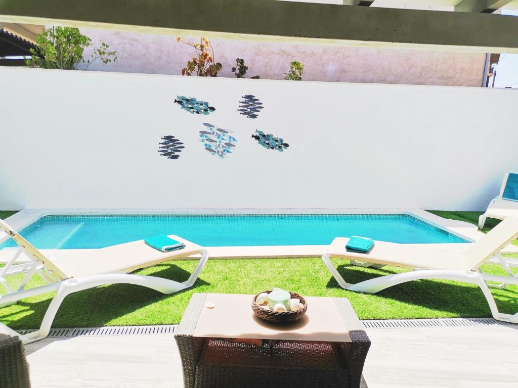 La bonita "Casa sa Padrina " se encuentra en Algaida, en la turística isla de Mallorca, e impresiona a los huéspedes con sus modernos interiores y con su preciosa zona exterior. Consta de un luminoso salón, una cocina bien equipada y con lavavajillas, 4 dormitorios (uno con 2 camas individuales, 3 con una cama de matrimonio cada uno), así como 2 baños y, por lo tanto, tiene capacidad para alojar a 7 personas. Entre los servicios adicionales se incluyen Wi-Fi, aire acondicionado y televisión por satélite. Uno de los principales atractivos de la propiedad es su encantadora zona exterior, donde encontrarás una terraza cubierta con cómodos sofás, una piscina donde podrás refrescarte en los días más calurosos, así como una mesa y algunas sillas. A través de una escalera se accede a otra terraza con 2 tumbonas, ideal para disfrutar del sol y relajarse con un buen libro. Encontrarás una selección de tiendas, restaurantes, bares y cafeterías en el centro de Algaida, a tan sólo 5 minutos a pie de la propiedad (500 m), mientras que las playas más cercanas, Playa Can Pastilla, Cala D'Or y Cala Estancia están a una media de 20 minutos conduciendo (son 19,5 km). La casa también está convenientemente situada cerca de Palma de Mallorca y su aeropuerto (22 minutos en coche; 24 km). La propiedad tiene un garaje disponible. La ropa de cama y las toallas están incluidas en el precio. La propiedad cobra los siguientes cargos adicionales: electricidad: 9 € por día; limpieza: 100 €; fianza: 350 €; ecotasa: 2,2€ por persona/día. Número de licencia: ETV/11990 Nombre: Casa Sa Padrina