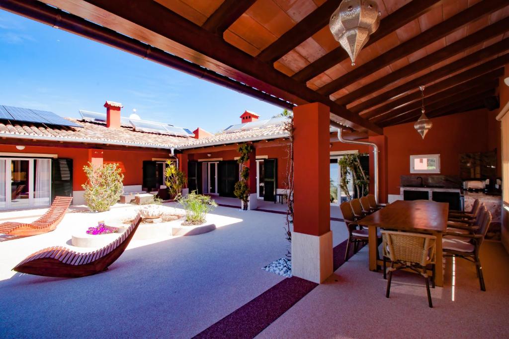 Ca'n Perla Golf es una finca independiente de color rojo rubí en Cala Murada. Debido a la forma de U, la casa de campo de una sola planta de 300 m² alberga una enorme terraza parcialmente cubierta. Aquí encontrará una cocina exterior, una amplia mesa de comedor y, por supuesto, tumbonas y muebles de salón donde podrá disfrutar plenamente de las vistas de la enorme finca verde con piscina, palmeras y limoneros. Una pista de petanca privada, un pequeño campo de golf y arena para jugar al voleibol de playa hacen de esta propiedad de 3.200 m² la perla perfecta para las vacaciones.