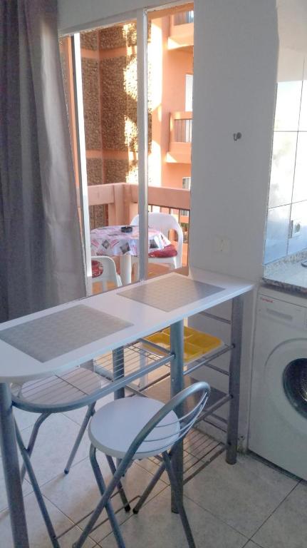 Coqueto estudio que dispone de un salón muy luminoso con acceso al balcón. Tiene grandes vistas a la ciudad. El balcón es ancho y se está genial tomando sol o desayunando. El estudio está equipado con todo lo necesario para pasar una estancia agradable. Ideal para parejas, o para familias con niños. gracias a sus 2 camas y el sofá-cama de 2 plazas. La cocina dispone de todo lo que necesita para preparar desayuno, almuerzo o cena. Además también se puede disfrutar de las zonas comunes, las piscinas y la cancha de tenis.