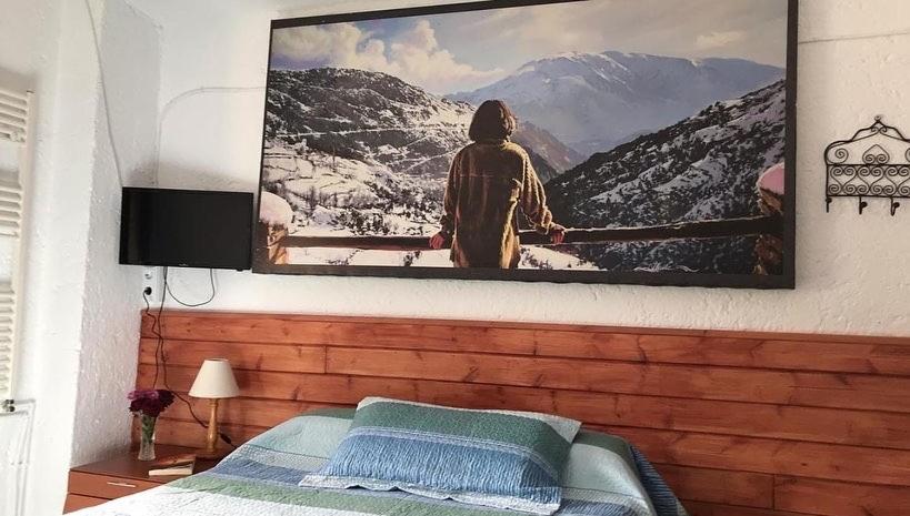 Una de las características más sobresalientes de este alojamiento es su cocina compartida, donde puedes preparar tus propias comidas. Desde la cocina, se pueden apreciar las increíbles vistas de las montañas de la Alpujarra.