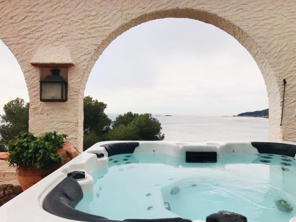 Magnífico chalet con vistas espectaculares en 1ª línea de mar en Llafranc, Costa Brava. Tiene una superficie de 443 m2, una capacidad para 10 personas y amplias terrazas con impresionantes vistas al mar. Está situada a 50 metros del mar en un lugar privilegiado y tranquilo y a 1.000 metros de la playa y del paseo marítimo de Llafranc. Dispone de terraza solarium con jacuzzi. Dimensiones: 204x204x90cm. La casa cuenta con 5 dormitorios dobles y 4 baños (3 de ellos en suite), 1 aseo, cocina totalmente equipada, gran salón-comedor con magníficas vistas al mar y varias terrazas alreadedor de la casa. Dispone de 4 plazas de parking en el terreno de la vivienda. No se admiten grupos de jóvenes . Para cualquier duda sobre esta propiedad, no dude en contactarnos.