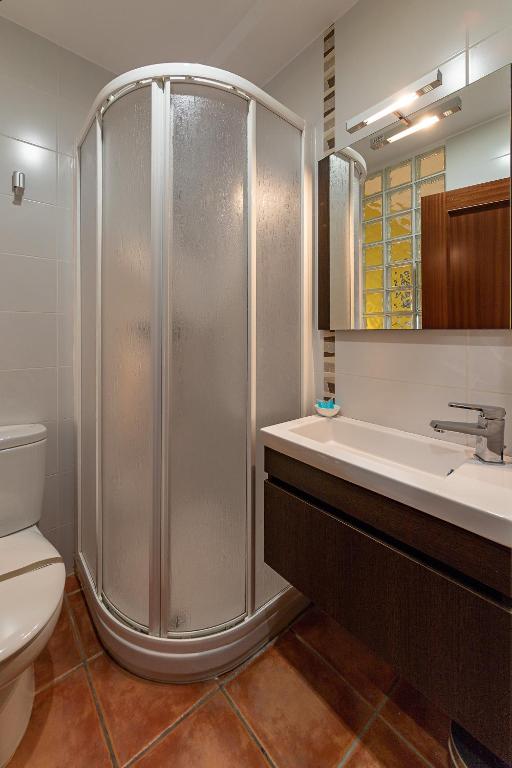 Los apartamentos son cómodos y disponen de terraza con vistas a El Calvario, una pequeña colina rodeada de pinos y coronada por la capilla blanca de Santa Bárbara. También tienen sala de estar con TV y reproductor de DVD, así como baño con bañera y secador de pelo.
