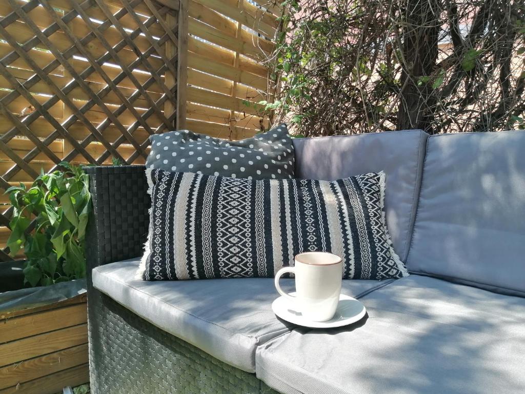 La casa está equipada con 1 dormitorio, 1 baño, ropa de cama, toallas, TV de pantalla plana, zona de comedor, cocina totalmente equipada y terraza con vistas al jardín.