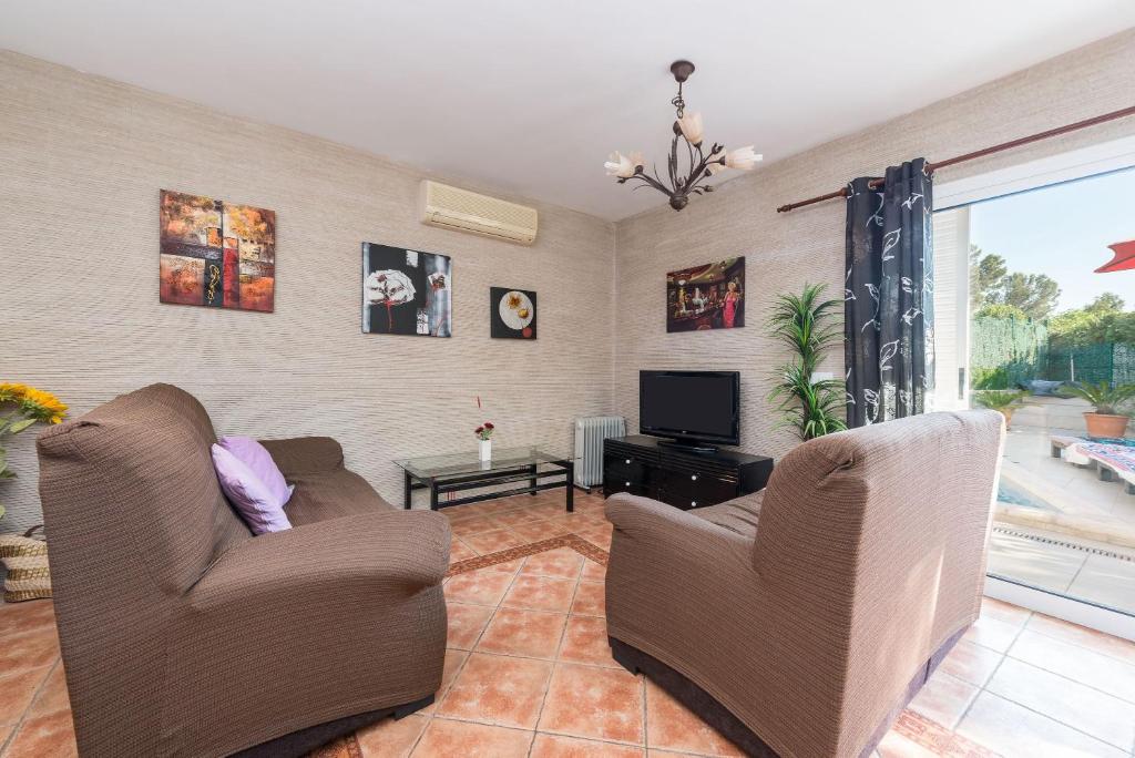 La casa tiene 3 dormitorios, TV y cocina totalmente equipada con microondas, nevera, lavadora, horno y fogones.