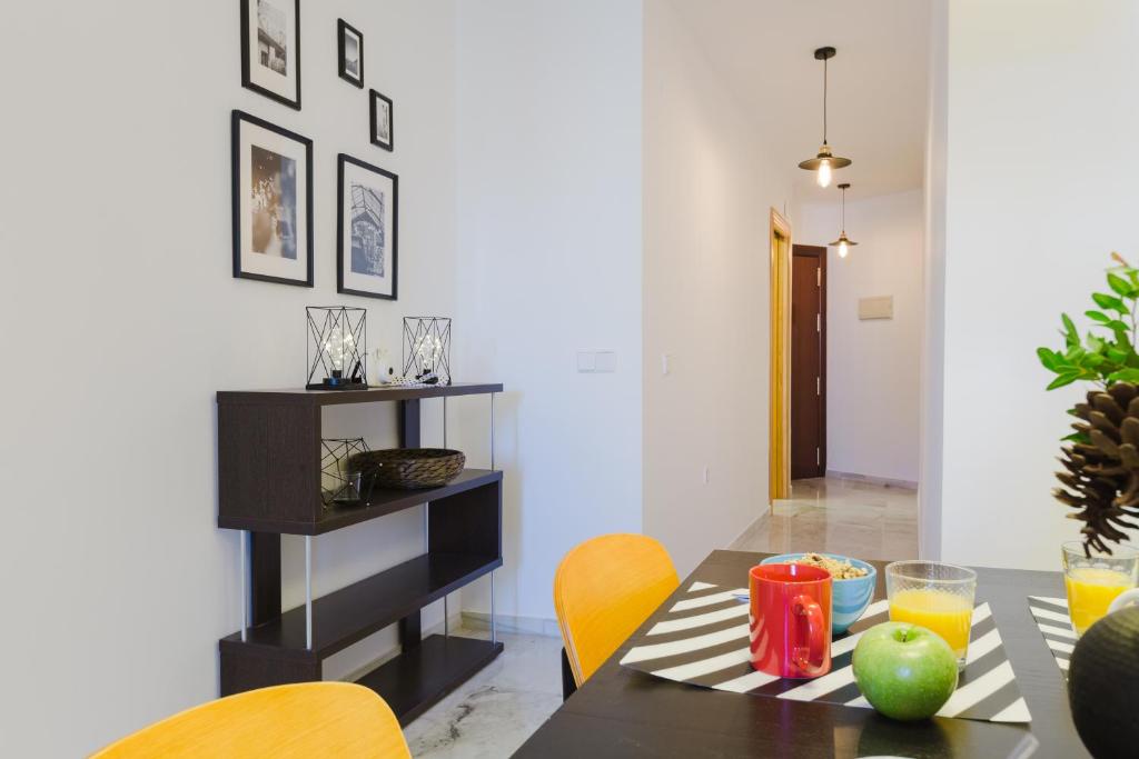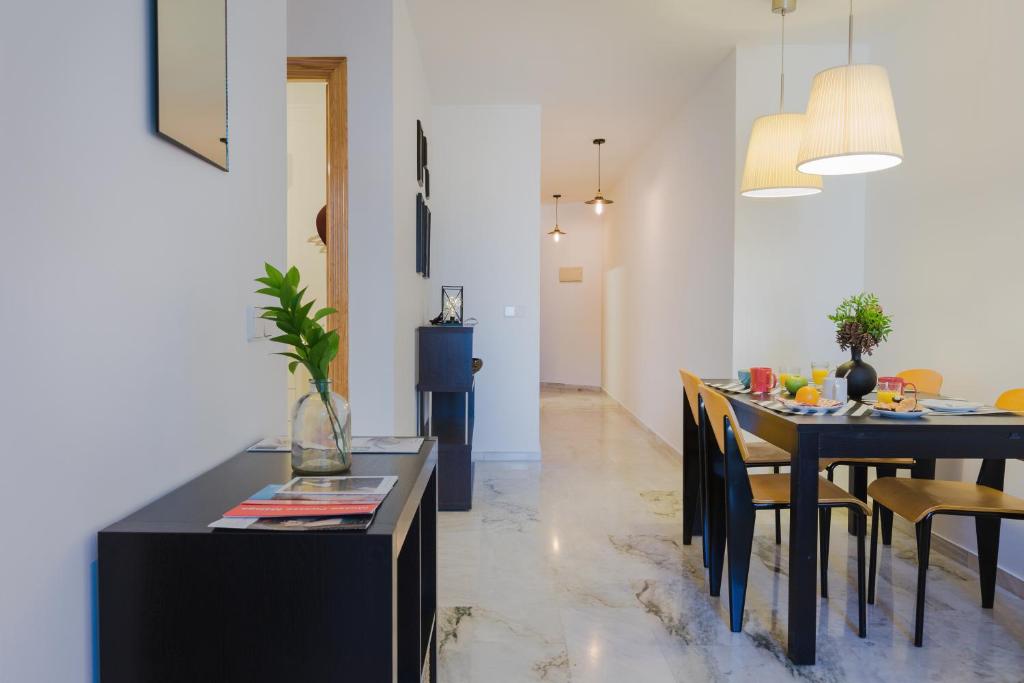 Apartamento decorado con estilo fresco y contemporáneo en un bonito edificio situado en pleno centro histórico de Málaga, junto al Mercado Central de Atarazanas y a la Alameda Principal, a 400 metros de calle Larios y a 500 metros de El Corte Inglés. La vivienda está completamente equipada, con aire acondicionado, TV de pantalla plana, cocina con todos los electrodomésticos (incluidos lavavajillas y horno). Perfecto para parejas, familias y grupos de amigos. El alojamiento dispone de cocina independiente con todo el menaje completo y con electrodomésticos de primeras marcas (vitrocerámica de inducción, lavavajillas, horno, nevera, microondas, lavadora). El amplio salón se distribuye en dos zonas diferenciadas, una espaciosa mesa (que se puede hacer aún mayor ya que es extensible) para comer, cenar o desayunar junto a tu familia y/o amigos, y otra parte con un gran sofá donde relajarte viendo la TV o charlando con tus amigos. Junto a la zona del sofá hay un bonito cierre con amplios ventanales desde donde se puede ver la Catedral y el Mercado de Atarazanas (ambos monumentos emblemáticos de la ciudad).
