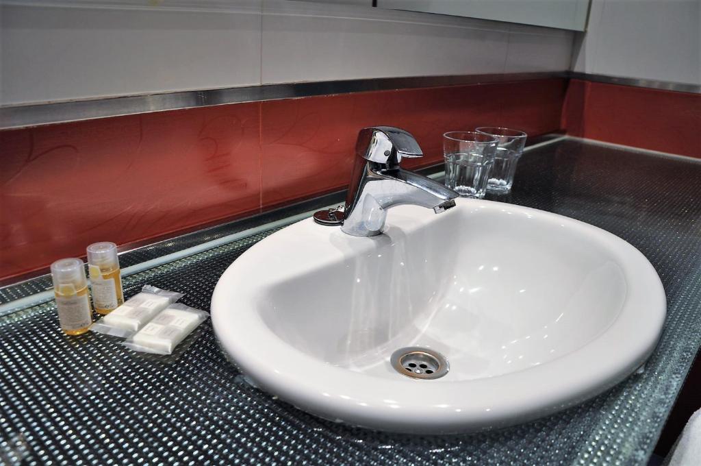 Las confortables habitaciones del Hotel Feria presentan una decoración funcional y suelo de madera y disponen de TV, caja fuerte y baño privado.