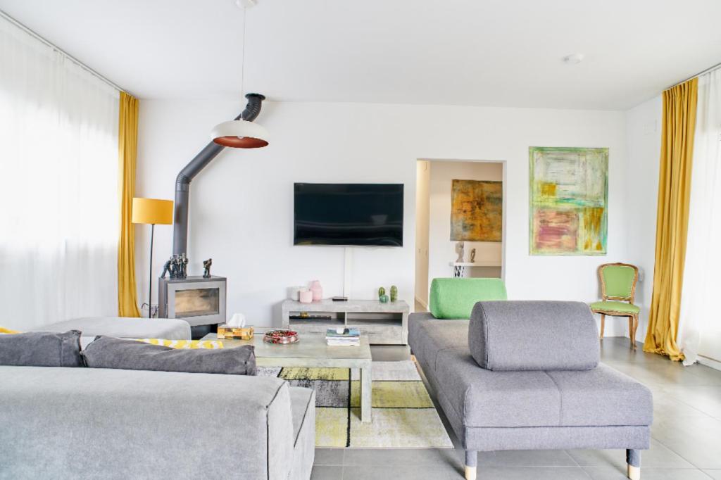 Espectacular casa, con una decoración moderna y cálida. Ubicado en un entorno EMBLEMÁTICO, rodeado de pinos y viñedos, dentro del parque natural del Garraf, donde se puede disfrutar de unas vistas espectaculares de las montañas y valles típicos de este paraje de naturaleza protegida. Un lugar IDEAL, a 4mn del centro de Sant Pere y a 10 minutos de Sitges (distancias calculadas en coche). IMPRESCINDIBLE disponer de vehículo propio o taxis para llegar a la casa ya que no hay transporte público, pero hay taxis desde el centro de Sant Pere. La casa es amplia con mucha luz, reformada recientemente. ideal para 5 personas. Cuenta con una habitación doble con una cama king-size con TV, una habitación con una cama doble, un cómodo sofá cama y 2 baños. Amplio salón con smart tv extra grande, internet, wifi. Cocina americana totalmente equipada, frigorífico, horno, microondas, lavavajillas, todos los utensilios de cocina necesarios. También tiene lavadora y secadora. Incluso una cuna y una trona. El exterior tiene un porche con mesa de comedor con vistas a la montaña, y muchos espacios de relajación y chiil-out alrededor de la piscina y la barbacoa.
