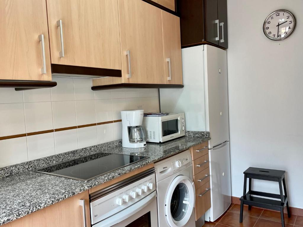 El apartamento cuenta con 2 dormitorios, TV de pantalla plana, lavadora, baño con bidet y cocina equipada con microondas y nevera.