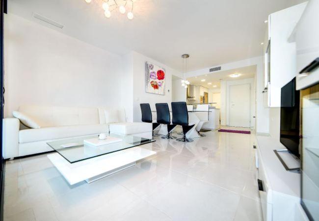 Apartamento en primera lnea de playa con vistas al mar. Pertenece al residencial Sea Senses de Punta Prima. Se ofrece para alquiler vacacional. Consta de un dormitorio con cama doble y otro con dos camas individuales, ambos cuentan con armarios empotrados para guardar la ropa. El saln es muy amplio decorado en estilo moderno y con acceso directo a la terraza. Cocina americana totalmente equipada con electrodomsticos y utensilios. Se ofrece tambin una plaza de garaje subterrneo. En el residencial hay varias piscinas, una de ellas con agua caliente en invierno. Un bar en el centro de la piscina, parque de juegos para nios, pista de padel, pequeo gimnasio y sauna. El barrio de Punta Prima es residencial y cuenta con varios restaurantes, cafeteras y comercios. A tan slo 5 km. del centro de Torrevieja y de la zona ms animada de Orihuela Costa. Amplia oferta deportiva en los alrededores campos de golf, club de tenis, pista de karts, deportes acuticos como jet-ski, padle surf. Importante Podr recoger las llaves de su alojamiento en las oficinas de Bennecke de lunes a viernes de 16.00h a 18.00h, excepto festivos. Fuera de este horario las llaves se recogern en una caja de seguridad.