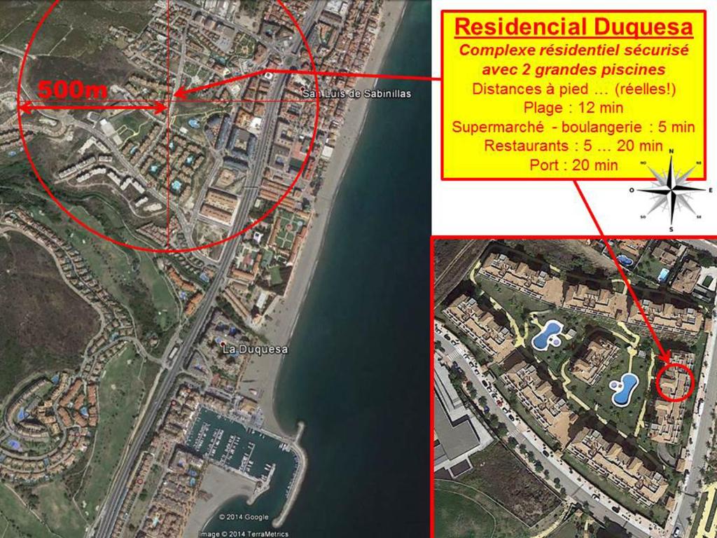 Situado en borde del pueblo de Sabinillas. Medio ambiente muy tranquilo, bien protegido de los ruidos de las carreteras principales. Ideal para vacaciones sin preocuparse de su coche, todo es accesible a pie: supermercado/panadería a 5 minutos, primeros restaurantes a 5 minutos, playa a 12 minutos, puerto a 20 minutos.
