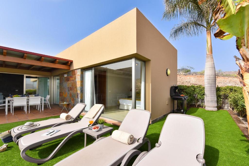 Self catered villa, 3 bedrooms for up to 6 people in Salobre Golf Resort, large garden and a wonderful swimming pool, only 10 minutes drive from Maspalomas and Meloneras beaches. Par 4 Villa 9 is an exclusive luxurious villa built in one story, ideal for families with children or people with reduced mobility. It counts on wide espaces, comfortable furniture and very bright rooms. Doubtlessly it is one of our favorite properties having a great value. Only a 10 minute drive from Meloneras and Maspalomas beaches, in Southern Gran Canaria This fantastic holiday private is the perfect home for your vacation in the Canary Islands, it counts on three double bedrooms; the main bedroom has a double bed, and an ensuite bathroom with shower. The second and third bedrooms have two single beds each and a second bathroom with shower. Two of the bedrooms have direct access to the garden and the swimming pool through sliding glass doors with views to the garden. The pool is heatable with a surcharge per week , there is a BBQ and outdoors dining area and large garden.