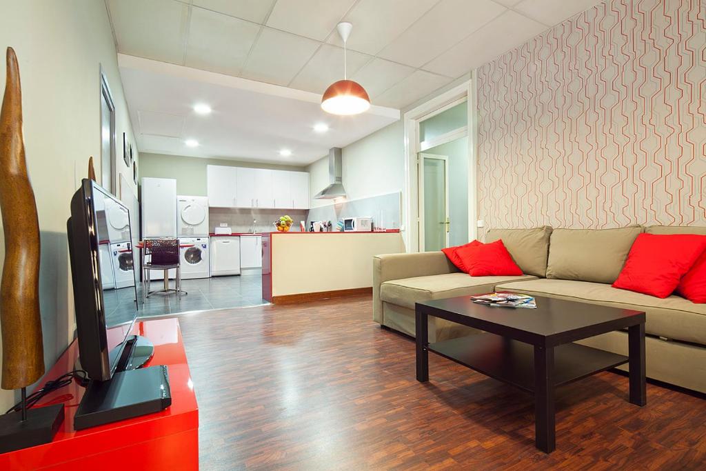 Todos los apartamentos del Samflat Barcelona cuentan con una sala de estar con TV de pantalla plana, reproductor de DVD y sofá, una cocina totalmente equipada con horno y lavavajillas y un baño con ducha y secador de pelo.