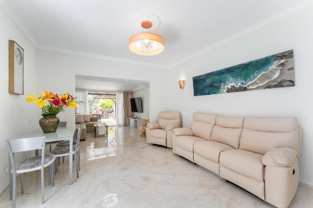 Sol del Sur! Cozy spacious bungalow with a garden, next to the ocean es un alojamiento con wifi gratis y vistas al jardín que está en Callao Salvaje, a solo 16 min a pie de Playa de Las Galgas y a 2 km de Playa El Pinque. El alojamiento, que se encuentra a 4 min a pie de Playa de Ajabo, ofrece terraza y parking privado gratis. Esta casa o chalet de 3 dormitorios ofrece TV de pantalla plana, aire acondicionado y sala de estar. El alojamiento ofrece cocina. Playa Las Salinas está a 2,4 km del alojamiento, y Aqualand está a 11 km. El aeropuerto más cercano (Aeropuerto de Tenerife Sur) está a 29 km del alojamiento.