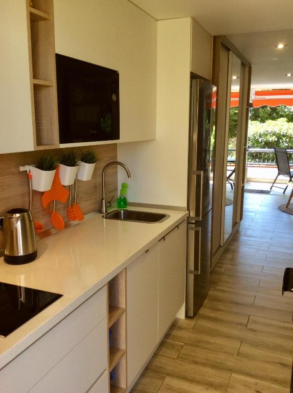 Pros: Apartment was very clean and well decorated. Just as photos show. Every Kitchen utensil you could imagine. Washing machine, dishwasher, hair dryer, there was even a window scraper for the bathroom mirror when it steamed up. Certainly a home from home.