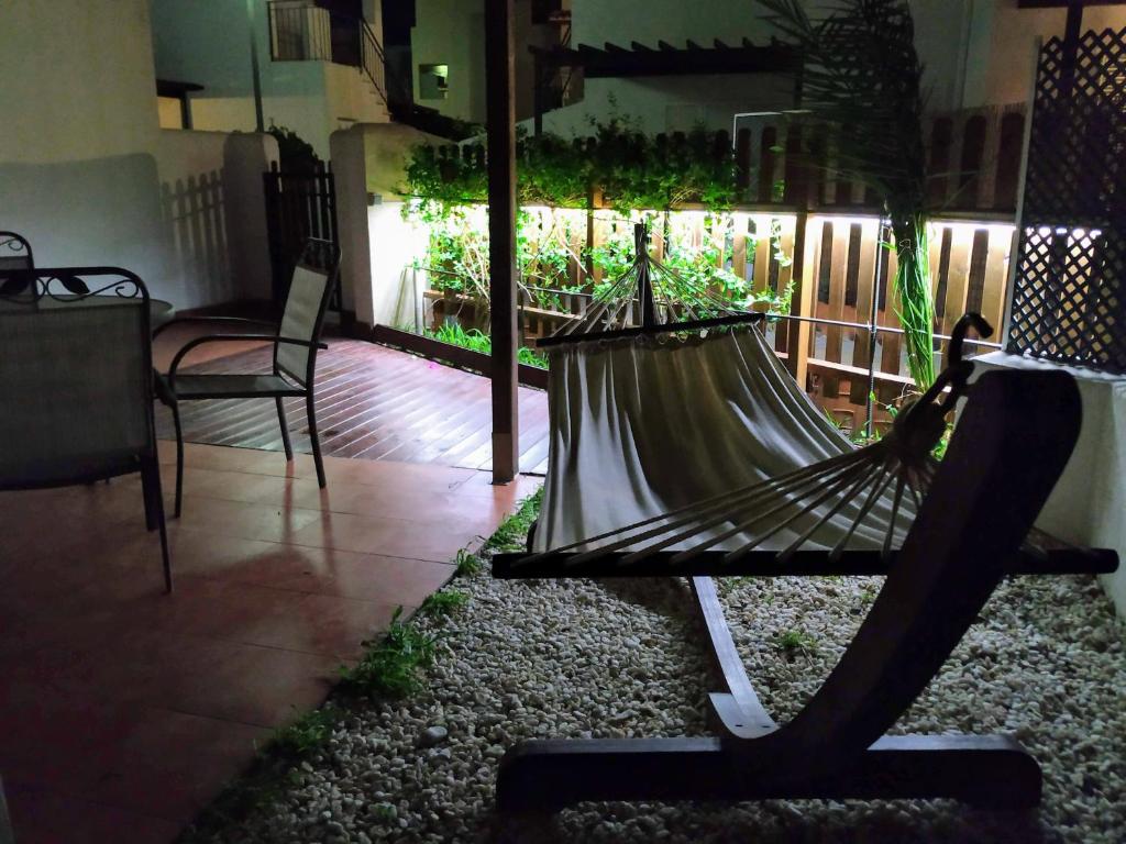 Este alojamiento se encuentra a 2 minutos a pie de la playa, situado en una zona naturista dentro del playazo de vera. Dispone de aparcamientos gratuitos dentro de la urbanización. El alojamiento tiene una terraza privada con hamaca, sillas y mesa, ideal para disfrutar de familia o amigos. En la planta baja también se encuentra un comedor, un aseo y una cocina equipada con todo tipo de menaje. En la primera planta se encuentra una cama de matrimonio y una litera, para las cuales se proporcionan ropa de cama y toallas. Desde el dormitorio se puede acceder a un cuarto de baño con plato de ducha. La urbanización dispone de piscinas grandes con hamacas y sombrillas gratuitas. Dos de las piscinas tienen vistas directas a la playa. Las piscinas son únicamente nudistas. También puede disfrutar de sus jardines para dar un paseo relajante. En la misma calle en la que se encuentra la urbanización hay una gran diversidad de bares, restaurantes y pizzerías tan solo a escasos metros. También lugares de ocio, diversión y música. Se encuentra a 6 km de Garrucha y a 10 km de Mojacar.