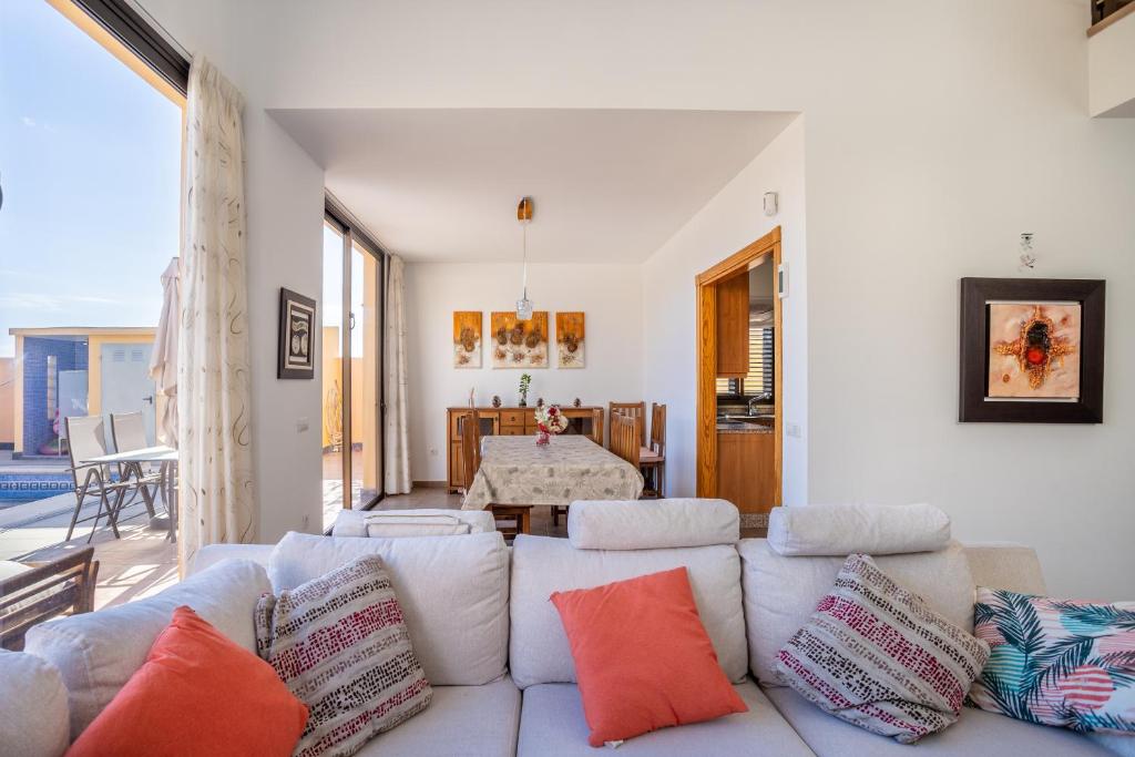 La villa está equipada con 3 dormitorios, 3 baños, ropa de cama, toallas, TV de pantalla plana, zona de comedor, cocina totalmente equipada y patio con vistas al mar.