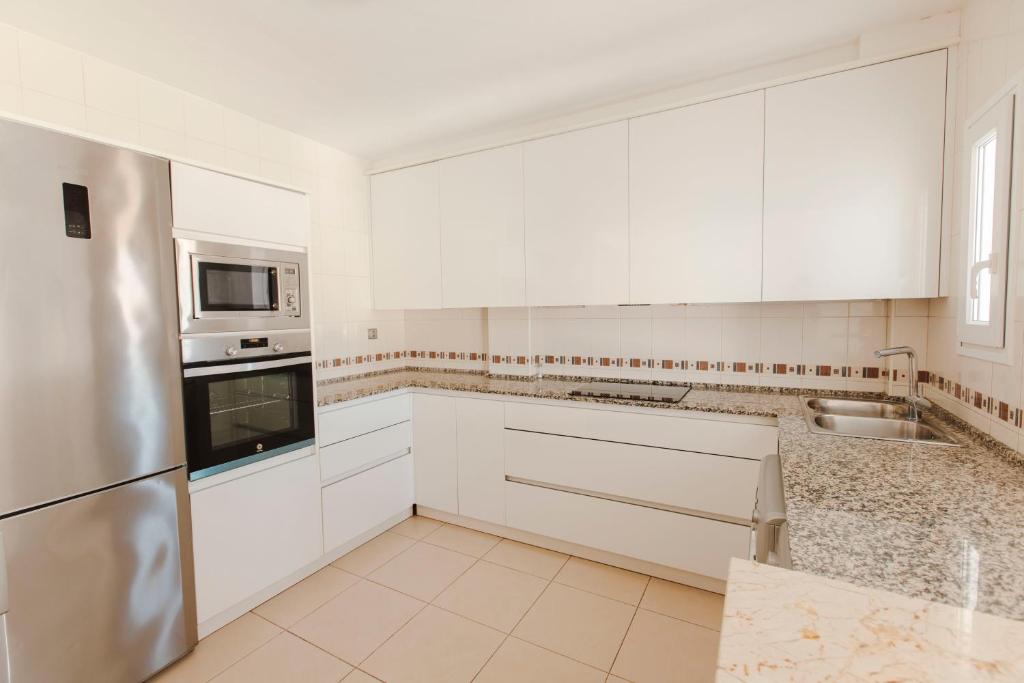El apartamento tiene 5 dormitorios, 3 baños, ropa de cama, toallas, TV, zona de comedor, cocina totalmente equipada y balcón con vistas al mar.