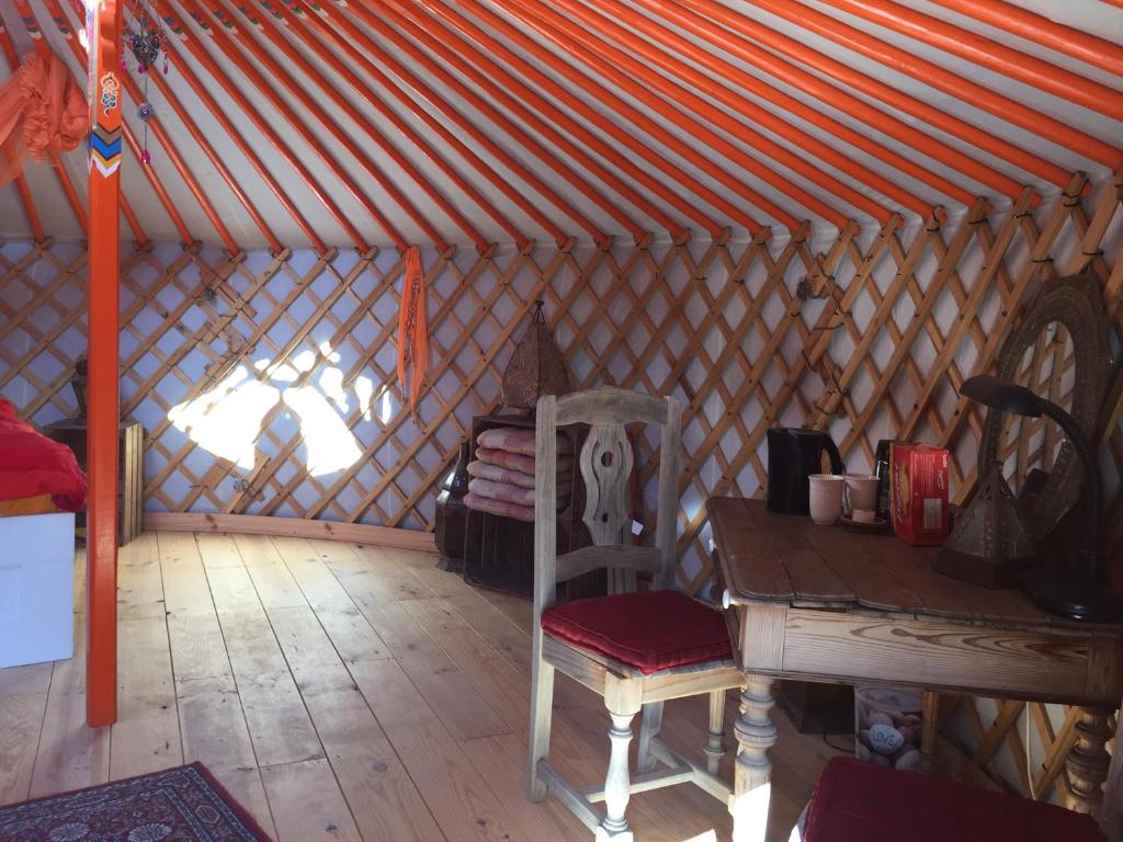 The original ecological manufactured Mongolian yurt is 6 meter in diameter, carved, and orange painted, all in mongolian style. The roof and walls have a wooden structure with two layers of canvas (one outer and one inner) and between a layer of 2 cm sheepwool and a vapor barrier. You can open the canvas wich covers the roofwindow, to see millions of stars by night (due to no lightpollution) from your bed!