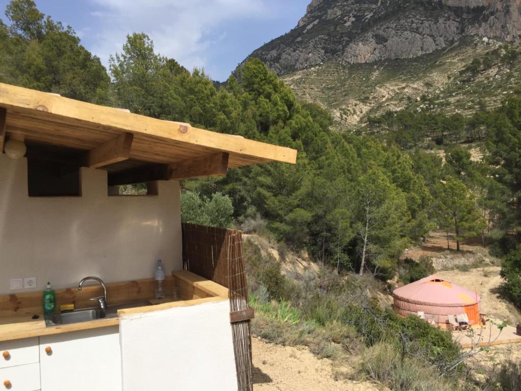The mountainvillage Finestrat is about 5 km away from the yurt, and has several bars, 2 pizzerias, several spanish restaurants, supermarkets. ATM’s to cash money, several banks, postoffice etc. Benidorm is about 12 km away from the yurt. The village is situated on a rock and during the evening iluminated. It is possible to arrange airporttransfers from and to Alicante airport, and also possible to rent a car, scooter or bicycle/mountainbike. Guided hiking routes are also possible. The mediterraenen sea is about 15 km from our terrain!